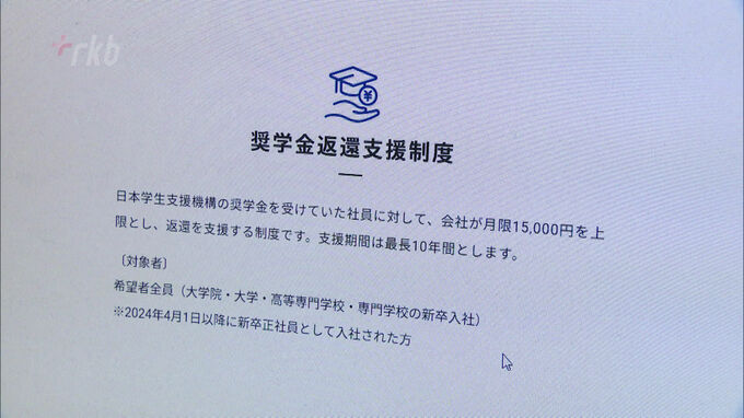 九電工が来年4月から始めるのは、日本学生支援機構から奨学金を借りていた新入社員を対象に、月額1万5000円を上限に本人に代わって返済する制度です。期間は最長10年間で、最大180万円を会社が負担します。九電工は、人手不足のため仕事を受けられない事例が出ているため、新卒の採用を強化して、人材の確保につなげたい考えです。