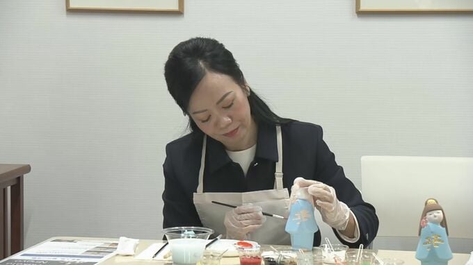 博多織について説明を受けた後、博多人形の絵付けを体験。博多人形師から指導を受けながら、一筆一筆丁寧に色づけをしていました。