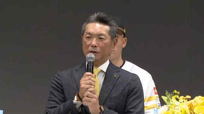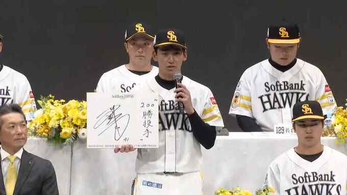 E・ZOFUKUOKAで行われた新入団選手の発表会見。真新しいユニホームを身にまとったルーキーたちを小久保監督がひとりひとり握手をして出迎えました。ドラフト1位、前田悠伍投手の背番号は千賀投手も背負った、41に決まりました。