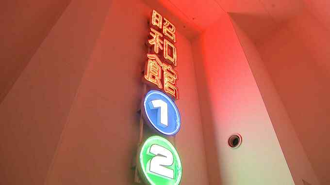 火事で焼けたネオン看板を再び灯したいという樋口さんの強い思いから、炎で割れてしまったネオン管だけを、同じ形状で同じ色のものに職人が手作業でつくりなおしました。看板そのものは、焼け跡から見つかった状態のままです。この看板を28年前に製作した北九州市の企業の職人が、再建した館内に取り付けました。