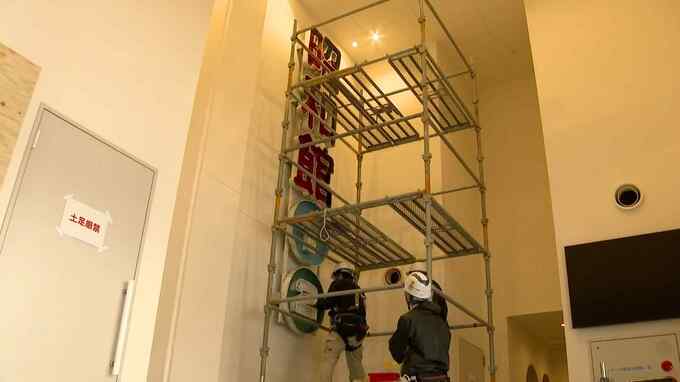 11月、再建が進む小倉昭和館を訪れると、あの焼け残ったネオン看板がありました。館内に飾ることにしたのです。