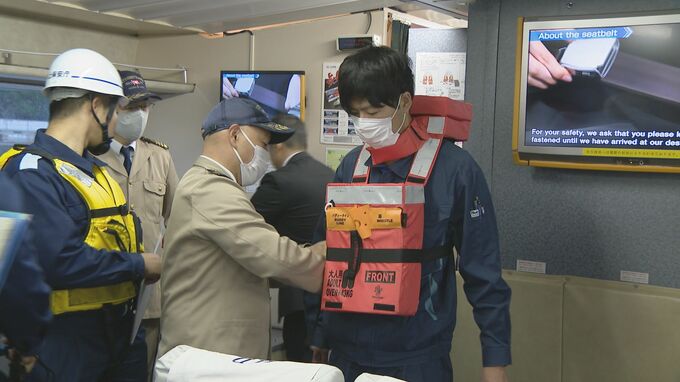 博多港では11日午前9時すぎから九州運輸局や福岡海上保安部の職員らが博多と長崎県の壱岐・対馬を結ぶ高速船「ヴィーナス」に乗り込み安全点検を行いました。乗務員の健康状態をはじめ、救命胴衣やシートベルトなどの安全設備が適切に設置されているかなど4項目について点検しました。