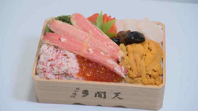 大丸福岡天神店で13日始まった「冬の北海道展」。大きなカニや新鮮なイクラなど北海道ならではの食材が並んでいます。毎年10万人以上が訪れる大人気の催事で、今年も多くの人が楽しみにしていたようです。礼文島産のウニとエビを使った「生ウニとボタンエビ入り海鮮たっぷり弁当」や、ズワイガニや毛ガニなどの「4大蟹メガ盛り弁当」がサンキュー価格として、3900円で販売されています。