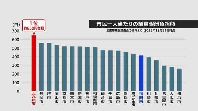 月額88万円の議員報酬は妥当か 削減案を否決した議会に市長が「違和感」 北九州市 2023年12月14日(木) 13:32 国内 ◆他の政令市と比べると 北九州市議は月額の報酬が88万円です。全国市議会議長会の資料よると、2022年12月31日時点の市民一人あたりの議員報酬の負担額は647.8円と、政令市の中で最も高くなっています。