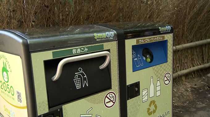 観光地として有名な京都・嵐山では9月に設置。近くの商店街によると、ゴミがあふれて散乱することがなくなったということです。