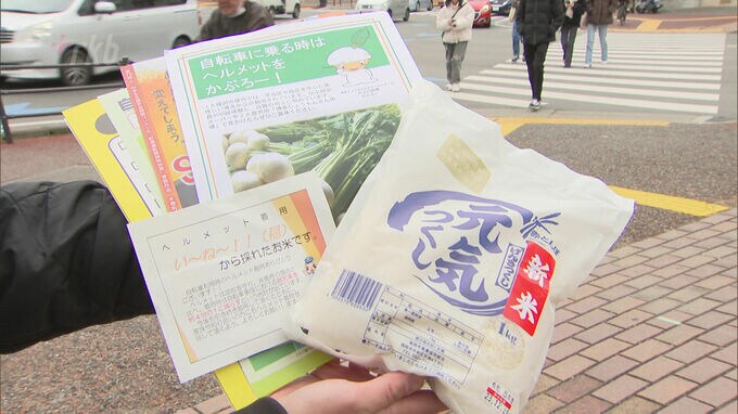 18日、福岡市城南区の交差点で実施されたのは、自転車ヘルメット着用「い~ね~!!」キャンペーンです。警察官などがヘルメットを着用していた人に「い~ね~!!」と声をかけお米を配りながら、自転車利用者にヘルメットの着用を呼びかけました。