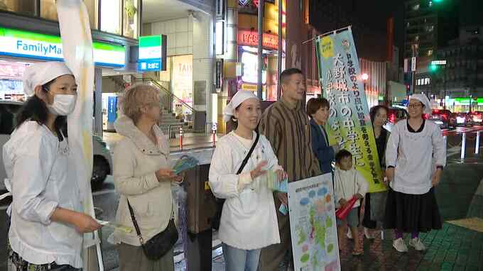 春日市では保護者の一部が全員制の給食を求め、声を上げています。街頭に立って理解を求めるチラシを配布していました。こうした保護者の活動は、2019年に大野城市から始まり、2023年からは、春日市や久山町にも広がっています。