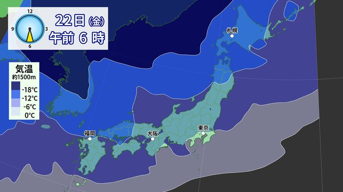 今回の寒気は西回りで流れ込みます。大雪の目安となる非常に強い寒気(上空1500メートル付近で氷点下12℃以下)が、九州北部や中国地方にまで南下。また、降水があれば平地でも雪として降る目安の寒気(上空1500メートル付近で氷点下6℃以下)が関東から九州南部の太平洋側までスッポリと覆う予想です。九州北部などの普段雪に慣れていないエリアでも積雪のおそれがあるほか、四国や東海など一部の太平洋側の地域でも雪が降る可能性があります。