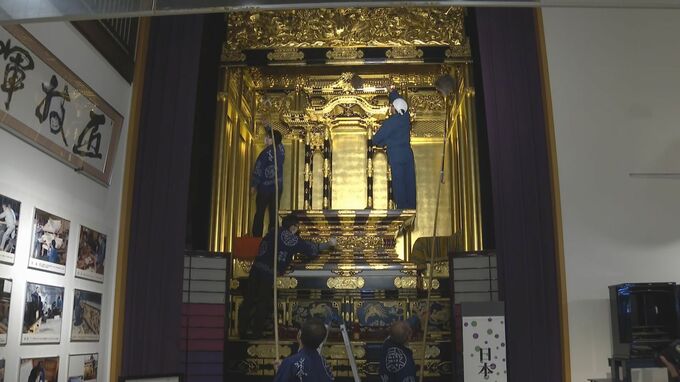 27日午前、八女市の八女伝統工芸館では、職人や地域の人がダチョウの羽がついた竹竿を使って、仏壇のちりやほこりを落としました。仏壇は高さ6.5メートル、幅3.8メートルで、日本一の大きさです。