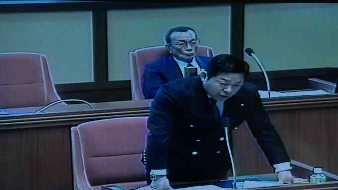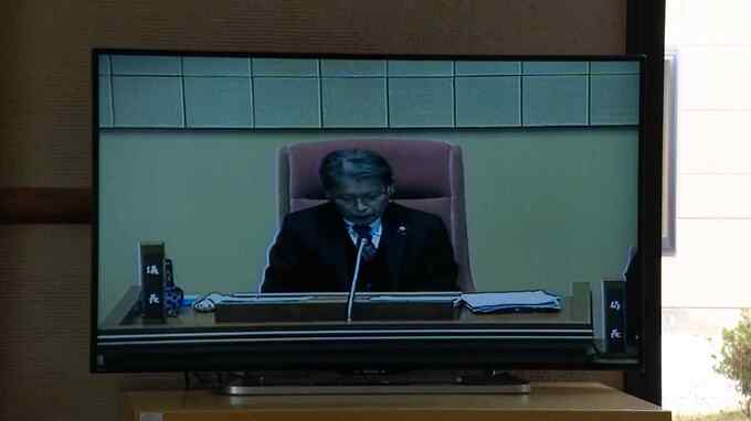 12月、庁舎内での撮影が一部認められ、大任町議会の様子を映すモニターを撮影することができました。この日の議会では、永原町長が町の予算から110万円を投じて逆告訴したことについて議員が質問しました。