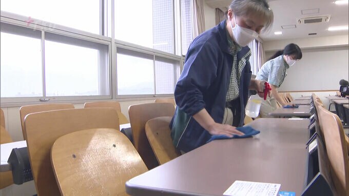このうち福岡市東区の福岡工業大学では、12日午前9時ごろから大学の職員たちが試験会場の設営作業を始めました。座席表を確認しながら、机の上に受験番号が書かれたシールを貼ったり、机や椅子を消毒したりしていました。