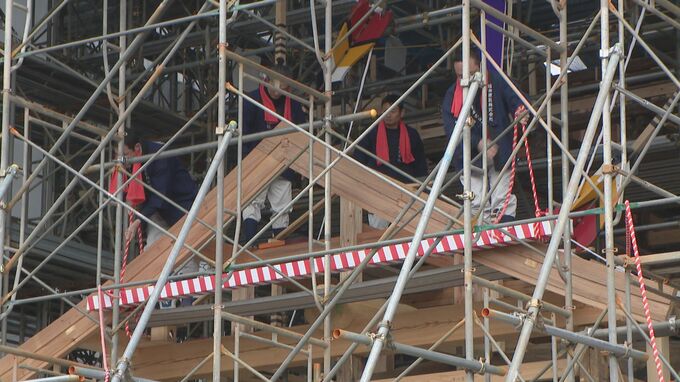 「潮見櫓」の上棟式には、工事関係者や福岡市の職員など約40人が参加しました。「潮見櫓」は、福岡城にあった木造2階建ての建物です。博多区の寺に移築されていましたが、去年2月から約4億円をかけて福岡城跡で復元工事が進められています。