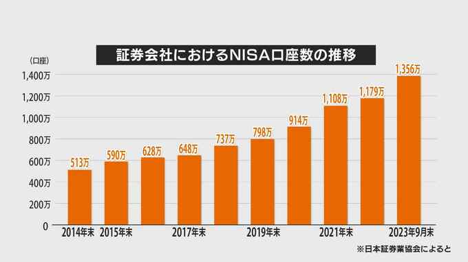 日本証券業協会によりますと、去年9月末時点でのNISAの口座数は1356万件と、前の年の年末に比べて15%増加しました。NISAが始まった10年前からの推移をみても年々、投資への関心が高まっているのがわかります。