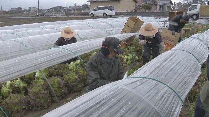 サニーレタスを育てる久留米市田主丸町の農家は、雪に備えて休みを返上して収穫していました。