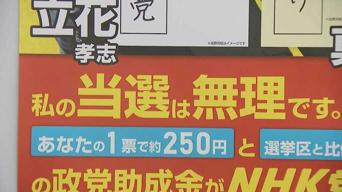 NHK党は今回、改選議席数3の福岡選挙区に3人の候補者を擁立するなどし全国ほぼすべての選挙区で定数と同じだけの候補者を擁立。その目的は候補者の当選ではなく、税金から拠出される政党助成金だと明言していました。