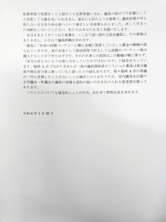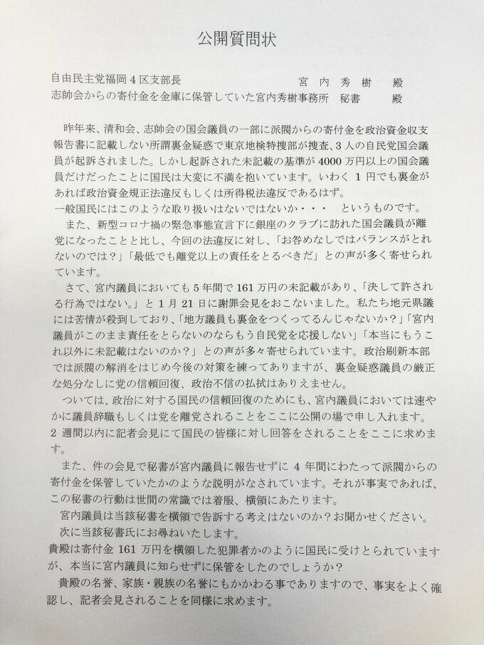 県議4人は、宮内氏に2週間以内に記者会見を開いて回答するよう求めています。