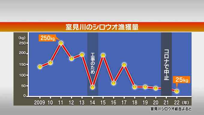 室見川のシロウオの漁獲量は、2011年には250キロありましたが、その後減少し、2022年には、わずか25キロになりました。