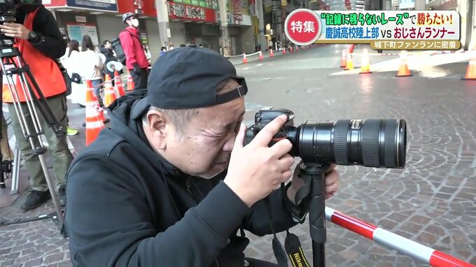 「下通アーケード」では沿道の観客が今か今かと、選手たちを待ちわびる中、念入りに撮影準備をする男性の姿が。