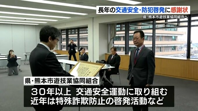 熊本県と熊本市の遊技業組合は、30年以上前から交通安全運動に取り組み、近年では特殊詐欺を防止する啓発活動などを行っています。