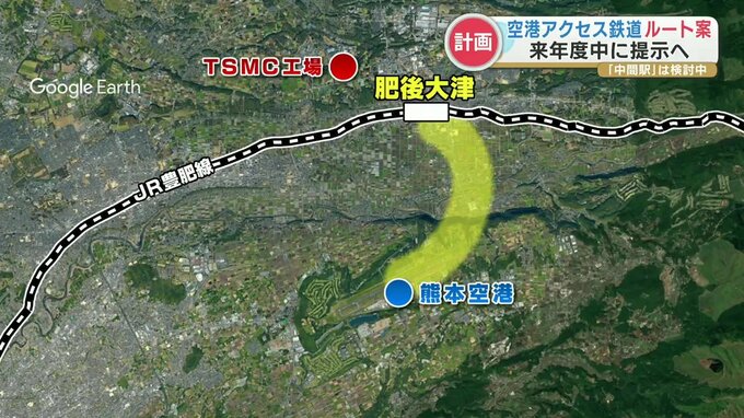 熊本空港アクセス鉄道 2025年度中に全体のルート案を提示へ 県は2027年度の工事着手、2034年度内の完成を目指す 2024年2月22日(木) 18:37 国内 JR肥後大津駅と熊本空港を結ぶ空港アクセス鉄道について、県は来年度内に全体のルート案を示す考えを明らかにしました。県が整備を計画している「空港アクセス鉄道」は、全長6・8キロで、JR豊肥線の肥後大津駅を出…