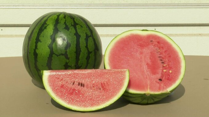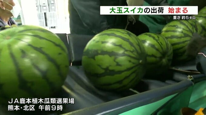 出荷されるスイカは去年11月に植えられ、1月中旬ごろの低温と日照不足で生育に遅れが見られたものの、2月に入り暖かい日が続いたことで重さおよそ5キロにまで育ちました。