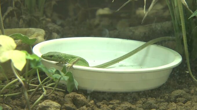 後生川 凜アナウンサー「ミヤコカナヘビの赤ちゃんはこの部屋にいるということです。こちら。草の間に隠れています。ちっちゃくて可愛いです」
