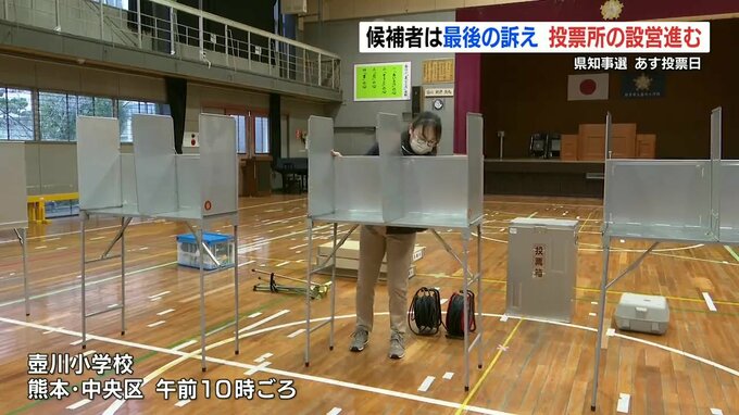 候補者が最後の訴え 熊本県知事選は24日が投票日 2024年3月23日(土) 11:07 国内 熊本県知事選挙は、24日が投票日です。県内では、投票所の設営など準備が進められています。今回の県知事選挙に立候補しているのは、いずれも無所属で新人の4人です。候補者たちは熊本市を中心に街頭活動を行い、…