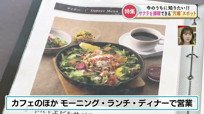 お花見のおともには、カフェメニューがあります。モーニングにランチ、ディナーにスイーツと好きな時間に楽しめます。