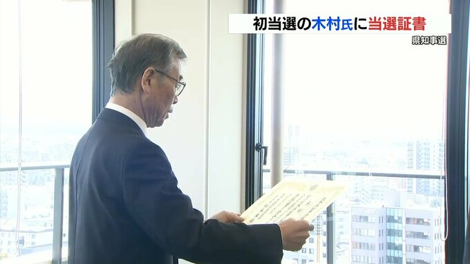 24日投開票が行われた県知事選挙で初当選を果たした木村敬(きむら たかし)さんに当選証書が手渡されました。