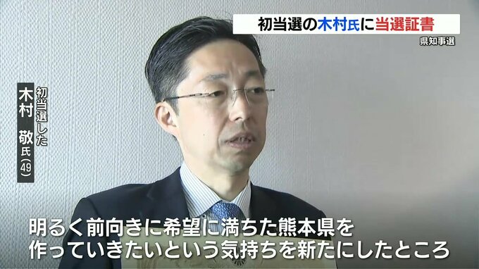 県選挙管理委員会 松永榮治 委員長「熊本県知事当選証書。木村敬さん。右は熊本県知事に当選したことを証明するため、ここに当選証書を付与する」