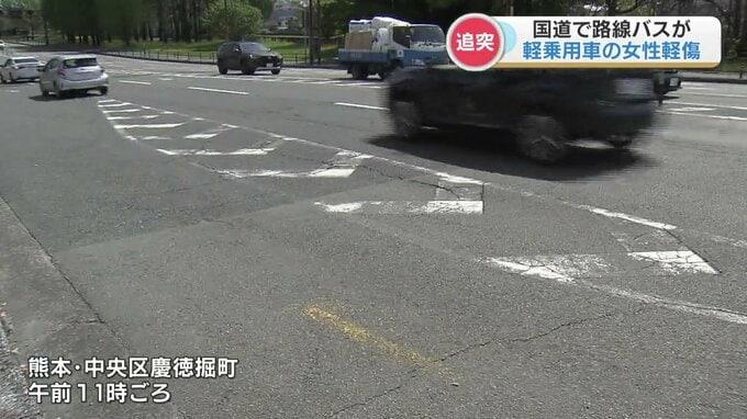 警察によりますと、きょう(4月12日)午前8時半ごろ熊本市中央区慶徳堀町(けいとくぼりまち)の国道3号で、九州産交の路線バスが追突事故を起こしました。