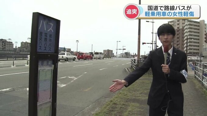記者「長六橋を渡ってきたバスは、このバス停付近に信号待ちのため止まっていた軽乗用車に追突しました」