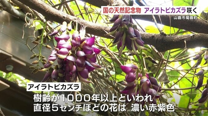 「大きな蝶のよう」天然記念物 アイラトビカズラ 咲き始める 2024年4月13日(土) 16:36 国内 13日、山鹿市菊鹿町に自生しているアイラトビカズラの花が咲き始めました。山鹿市菊鹿町の相良(あいら)地区に自生しているアイラトビカズラは樹齢が1000年以上といわれ、直径5センチほどの花は 濃い赤紫色…