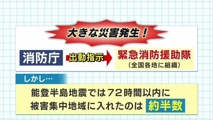 しかし、能登半島地震では発生から72時間で緊急消防援助隊の約半数しか被害集中地域に辿り着けませんでした。