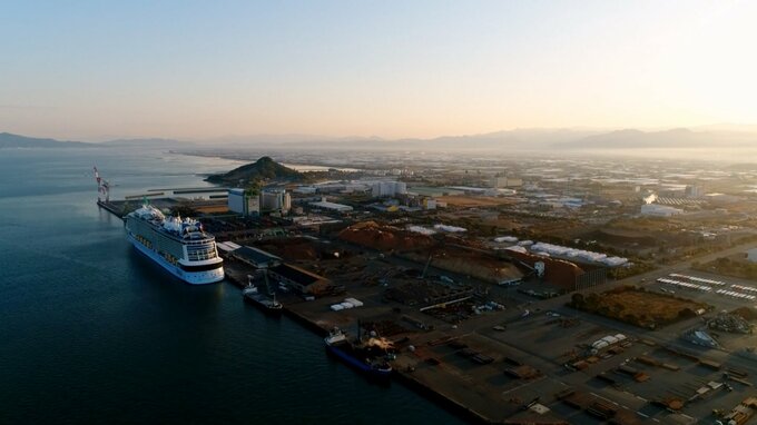八代港周辺の沿岸部には鉄道や高速道路など、陸上の交通網とも隣接する恵まれた立地条件から多くの工場が立ち並びます。八代はもとより九州各地から集まる地域資源を活用し、世界レベルのものづくりが行われています。八代港は去年、国の「国際クルーズ拠点」の一つとなり、世界最大級のクルーズ船も受け入れられるよう現在専用の岸壁などが作られています。利用開始は2020年、去年実績のおよそ3倍となる年間200隻ほどの寄港を目指していてさらに多くの人と物が行き交う港になりそうです。」
