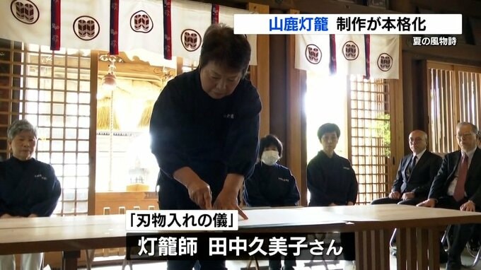熊本県山鹿市の大宮(おおみや)神社で行われた制作開始祭(せいさくかいしさい)では、「刃物入れの儀」として灯籠師を代表して田中久美子(たなか くみこ)さんが、材料となる和紙を切り制作が滞りなく進むよう祈願しました。