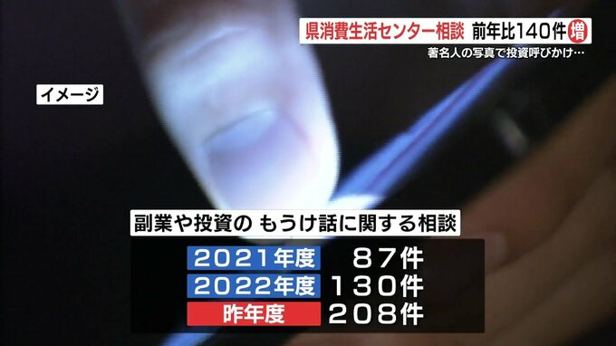 特にSNSを巡る20代からの相談が多く、著名人の写真を載せて投資を呼び掛けるものや、「簡単に稼げる」などの表現に惹かれて、5000万円の被害に遭った人もいるということです。