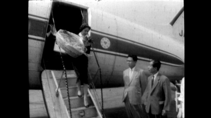 昭和35年(1960)6月、熊本空港に札幌からスズランの花束が到着した映像です。