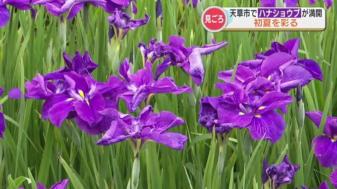 熊本県天草市のショウブ園で色鮮やかなハナショウブが咲き誇り、初夏を彩っています。