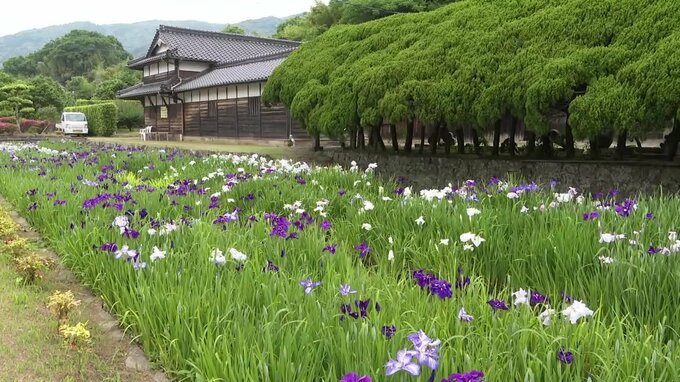 天草市楠浦町(くすうらまち)で庄屋跡に建つ宗像秀明(むなかた ひであき)さん宅では、季節の花々を楽しんでもらおうと、20年ほど前から約60坪のお堀沿いにハナショウブを植えています。
