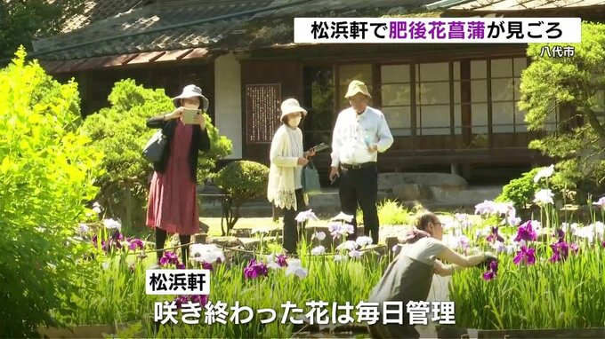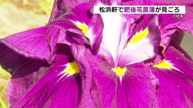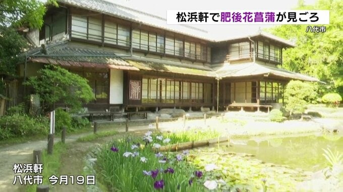 国の文化財、名勝に指定されている熊本県八代市の『松浜軒(しょうひんけん)』では、新緑に囲まれた日本庭園で肥後花菖蒲(はなしょうぶ)が見ごろを迎えています。
