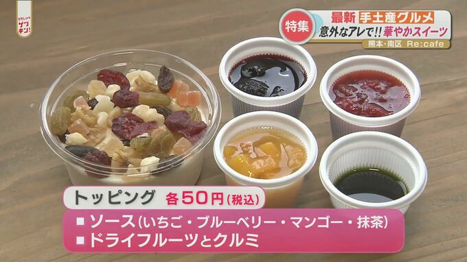 4 種類のソース、ドライフルーツとくるみのトッピングもそれぞれ50 円でつけることができます。