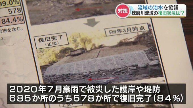 協議会では、2020年の豪雨で被害を受けた球磨川流域の護岸や堤防685か所のうち、84%にあたる578か所で復旧が完了していることが報告されました。