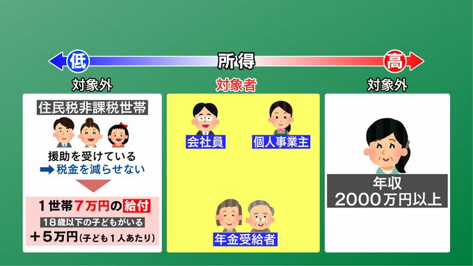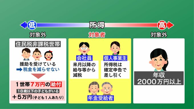 住民税非課税世帯の方はすでに援助を受けていて、税金を減らせないため対象外ということです。ただその代わりに、非課税世帯には1世帯7万円の給付があります。