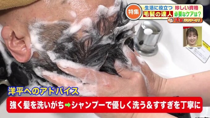 リポーターの場合は「強く髪を洗いがちで頭皮に炎症がみられる」ということで、泡だてたシャンプーでやさしく洗う&すすぎを丁寧にする