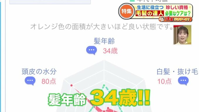 さらに詳しく診断をしたあとには、毛髪のカルテも作成します。リポーターの髪年齢は…ズバリ34歳(実年齢46歳)!