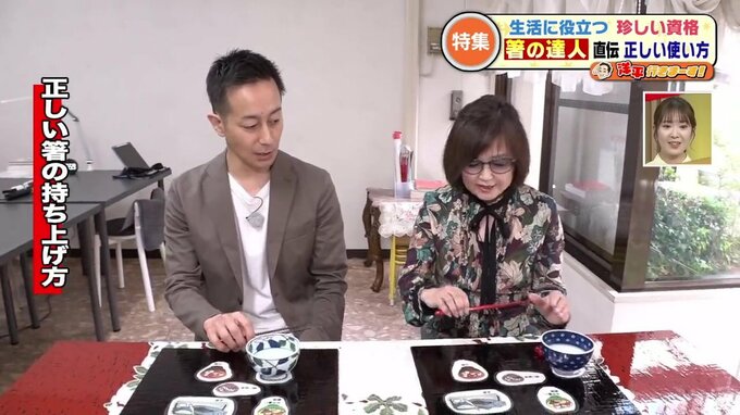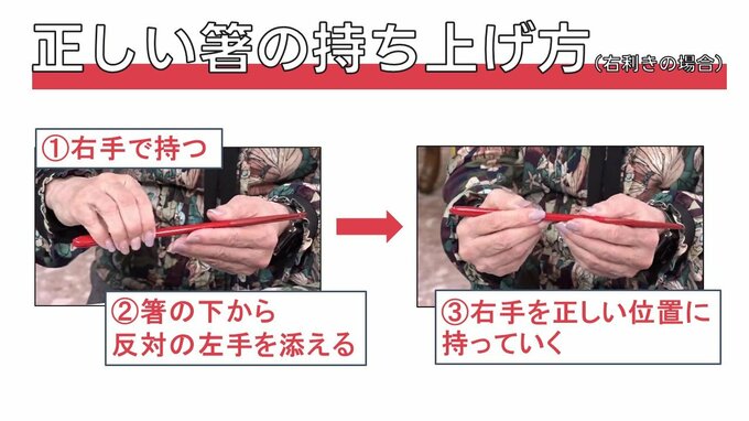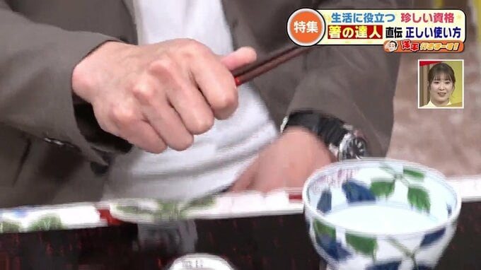 まずはリポーターがいつも通りの箸の持ち方をしてみると、冨田さんからさっそくNGが。間違えていたのは、箸の持ち上げ方です。リポーターは右手で箸を握りしめて持ち上げていましたが…