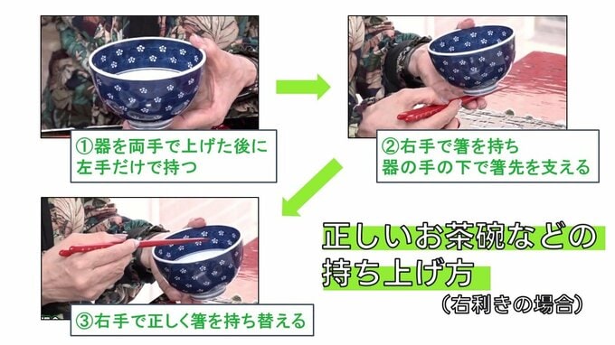 ちなみに、お茶碗などの正しい持ち上げ方も教えてもらいました。