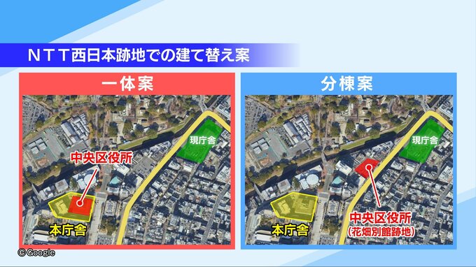 分棟案:本庁舎は「NTT西日本桜町ビル跡地」に、中央区役所は「花畑別館跡地」に建てる