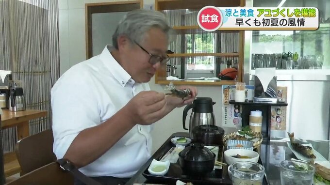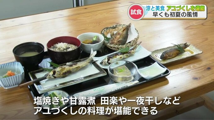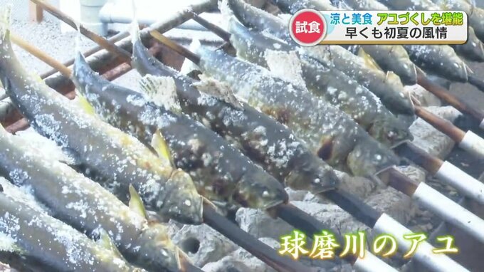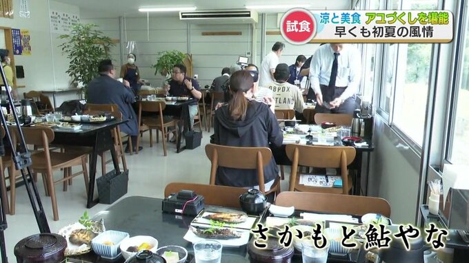 笑顔で豪快にかぶりついているのは、球磨川のアユ。球磨川の清流を前に焼きたての鮎などが味わえる『さかもと鮎やな』です。店内には香ばしい香りが漂います。